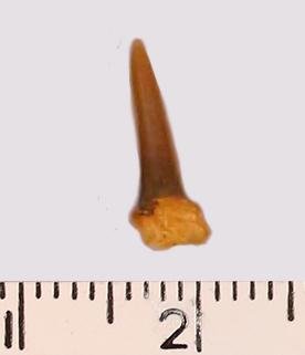 Коронка мелкого переднего? зуба рыжевато-бежевого цвета, колюще-режущего типа, с гладким режущим краем. Корень не сохранился.