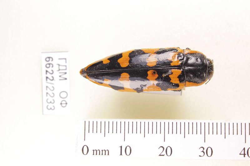 Сухое насекомое. Златка. Cyrioides imperialis (Fabricius, 1801). Классификация: Членистоногие Arthropoda, Насекомые Insecta, Жуки Coleoptera, Златки Buprestidae