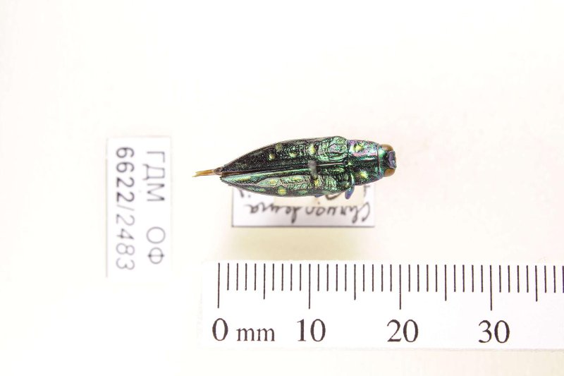 Сухое насекомое. Златка. Chrysodema fossulipennis Obenberger, 1922. Классификация: Членистоногие Arthropoda, Насекомые Insecta, Жуки Coleoptera, Златки Buprestidae