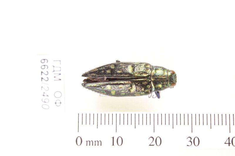 Сухое насекомое. Златка. Chrysodema fossulipennis Obenberger, 1922. Классификация: Членистоногие Arthropoda, Насекомые Insecta, Жуки Coleoptera, Златки Buprestidae