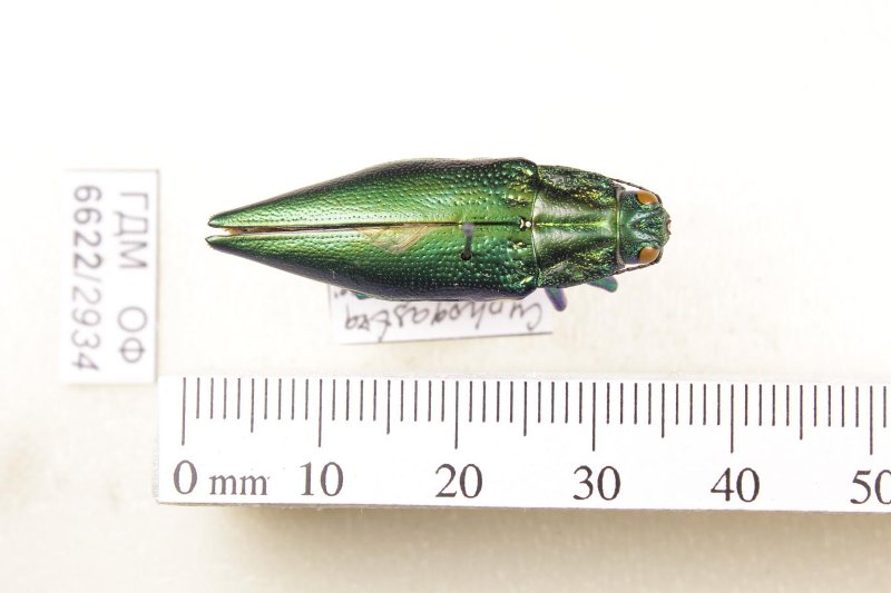 Сухое насекомое. Златка. Cyphogastra waterhousei Théry, 1926. Классификация: Членистоногие Arthropoda, Насекомые Insecta, Жуки Coleoptera, Златки Buprestidae
