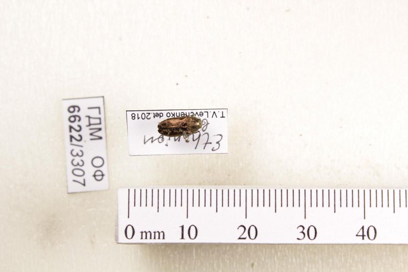 Сухое насекомое. Златка. Ethonion breve (Carter, 1923). Классификация: Членистоногие Arthropoda, Насекомые Insecta, Жуки Coleoptera, Златки Buprestidae