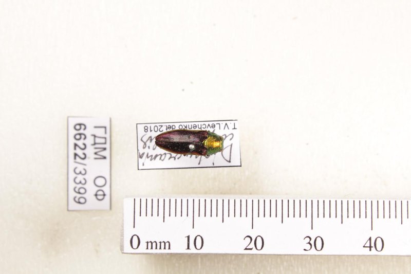Сухое насекомое. Златка. Diphucrania cupreicollis (Hope, 1846). Классификация: Членистоногие Arthropoda, Насекомые Insecta, Жуки Coleoptera, Златки Buprestidae