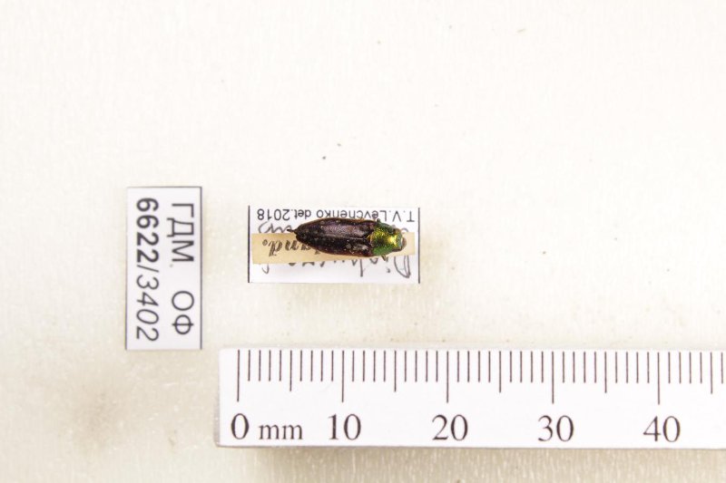 Сухое насекомое. Златка. Diphucrania cupreicollis (Hope, 1846). Классификация: Членистоногие Arthropoda, Насекомые Insecta, Жуки Coleoptera, Златки Buprestidae