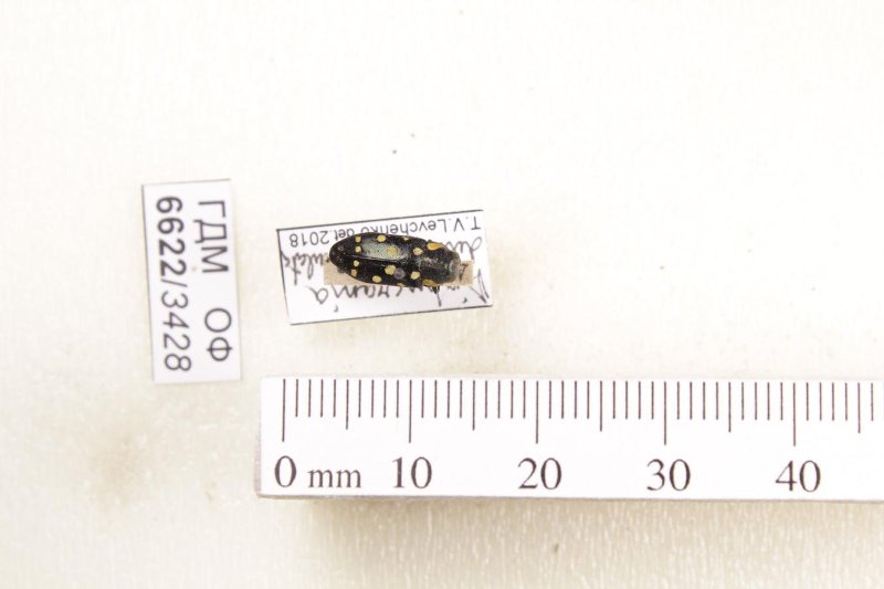 Сухое насекомое. Златка. Diphucrania duodecimmaculata (Fabricius, 1801). Классификация: Членистоногие Arthropoda, Насекомые Insecta, Жуки Coleoptera, Златки Buprestidae