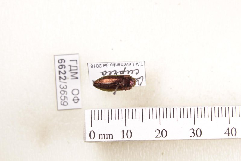 Сухое насекомое. Златка. Oedisterna cuprea (Linnaeus, 1758). Классификация: Членистоногие Arthropoda, Насекомые Insecta, Жуки Coleoptera, Златки Buprestidae