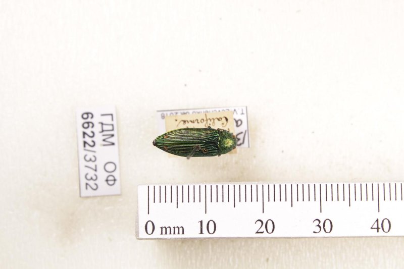 Сухое насекомое. Златка. Buprestis apricans Herbst, 1801. Классификация: Членистоногие Arthropoda, Насекомые Insecta, Жуки Coleoptera, Златки Buprestidae