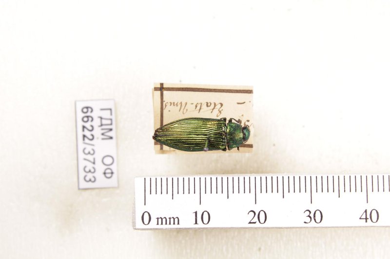 Сухое насекомое. Златка. Buprestis apricans Herbst, 1801. Классификация: Членистоногие Arthropoda, Насекомые Insecta, Жуки Coleoptera, Златки Buprestidae
