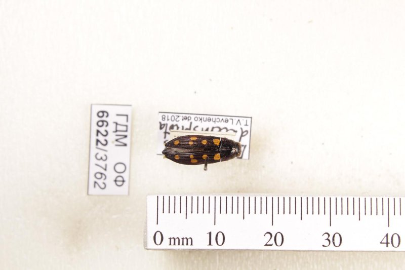 Сухое насекомое. Златка. Buprestis decemspilota Hope, 1831. Классификация: Членистоногие Arthropoda, Насекомые Insecta, Жуки Coleoptera, Златки Buprestidae