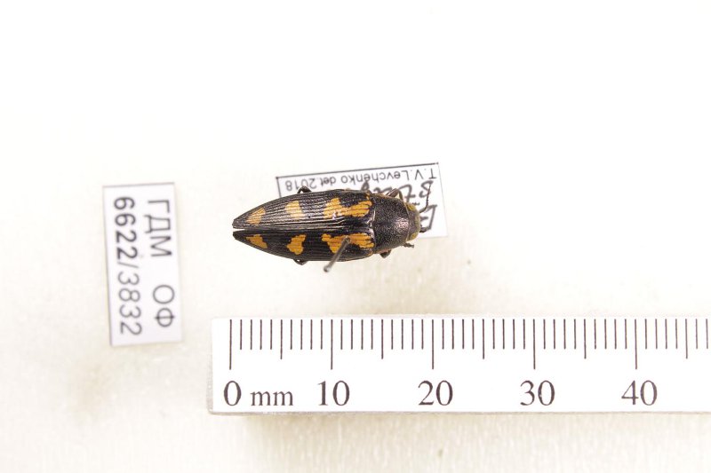 Сухое насекомое. Златка. Buprestis strigosa Gebler, 1830. Классификация: Членистоногие Arthropoda, Насекомые Insecta, Жуки Coleoptera, Златки Buprestidae