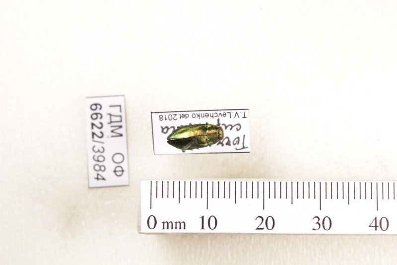 Сухое насекомое. Златка. Torresita cuprifera (Kirby, 1818). Классификация: Членистоногие Arthropoda, Насекомые Insecta, Жуки Coleoptera, Златки Buprestidae
