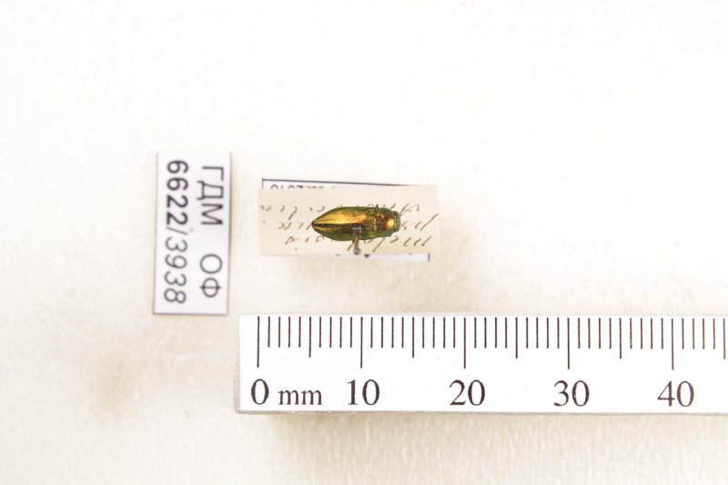 Сухое насекомое. Златка. Melobasis propinqua (Laporte et Gory, 1837). Классификация: Членистоногие Arthropoda, Насекомые Insecta, Жуки Coleoptera, Златки Buprestidae