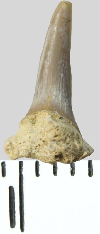 Зуб (фрагмент). Акула. Scapanorhynchus eorhaphiodon Glueckman, 1980. Классификация: Хордовые Chordata, Позвоночные Vertebrata, Хрящевые рыбы Chondrichthyes, Пластиножаберные Elasmobranchii