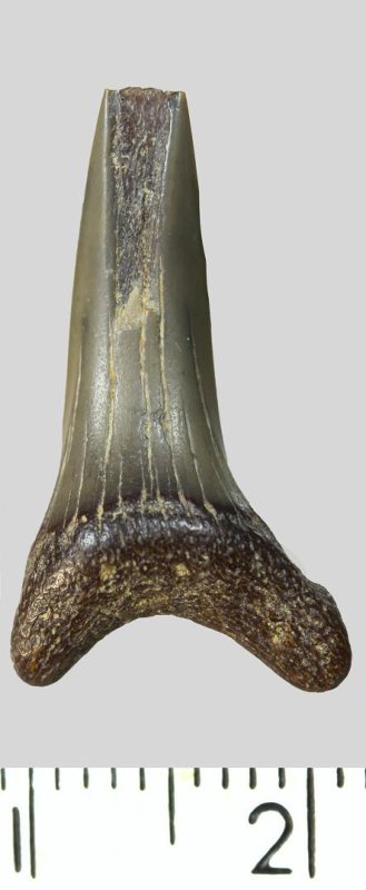 Зуб. Акула. Scapanorhynchus gigas Woodward, 1889. Классификация: Хордовые Chordata, Позвоночные Vertebrata, Хрящевые рыбы Chondrichthyes, Пластиножаберные Elasmobranchii