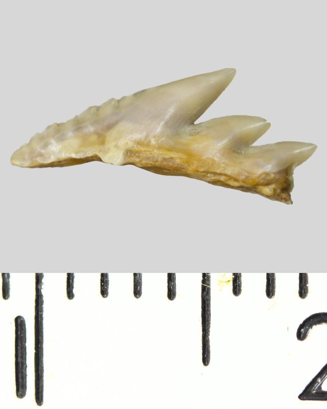 Зуб (фрагмент). Акула. Notidanus microdon Agassiz, 1843. Классификация: Хордовые Chordata, Позвоночные Vertebrata, Хрящевые рыбы Chondrichthyes, Пластиножаберные Elasmobranchii