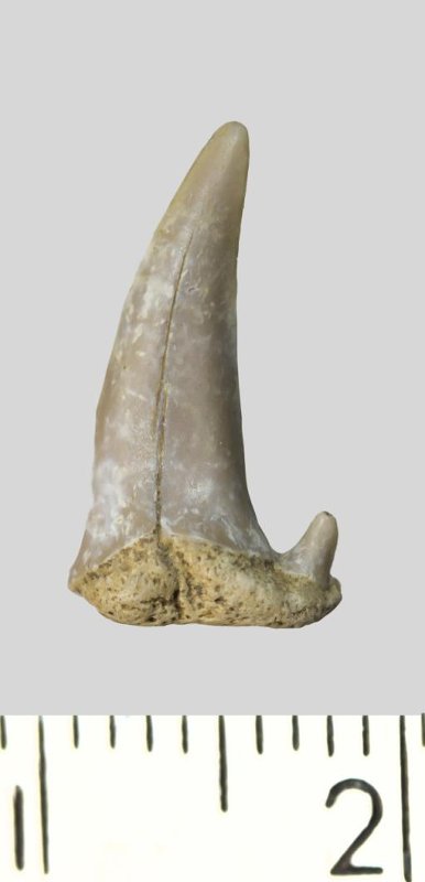 Зуб (фрагмент). Акула. Palaeohypotodus rutoti (Winkler, 1874). Классификация: Хордовые Chordata, Позвоночные Vertebrata, Хрящевые рыбы Chondrichthyes, Пластиножаберные Elasmobranchii