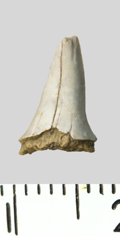 Зуб (фрагмент). Акула. Palaeohypotodus rutoti (Winkler, 1874). Классификация: Хордовые Chordata, Позвоночные Vertebrata, Хрящевые рыбы Chondrichthyes, Пластиножаберные Elasmobranchii