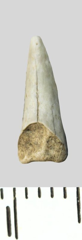 Зуб (фрагмент). Акула. Palaeohypotodus rutoti (Winkler, 1874). Классификация: Хордовые Chordata, Позвоночные Vertebrata, Хрящевые рыбы Chondrichthyes, Пластиножаберные Elasmobranchii