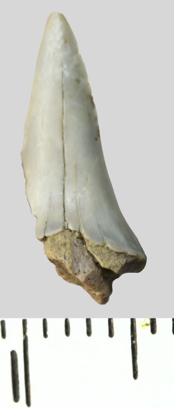 Зуб (фрагмент). Акула. Palaeohypotodus rutoti (Winkler, 1874). Классификация: Хордовые Chordata, Позвоночные Vertebrata, Хрящевые рыбы Chondrichthyes, Пластиножаберные Elasmobranchii