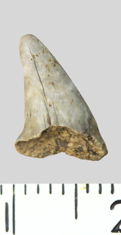 Зуб (фрагмент). Акула. Palaeohypotodus rutoti (Winkler, 1874). Классификация: Хордовые Chordata, Позвоночные Vertebrata, Хрящевые рыбы Chondrichthyes, Пластиножаберные Elasmobranchii
