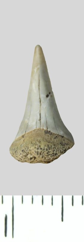 Зуб (фрагмент). Акула. Palaeohypotodus rutoti (Winkler, 1874). Классификация: Хордовые Chordata, Позвоночные Vertebrata, Хрящевые рыбы Chondrichthyes, Пластиножаберные Elasmobranchii