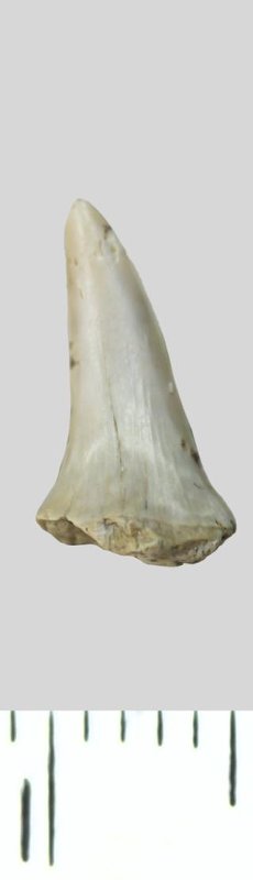 Зуб (фрагмент). Акула. Palaeohypotodus rutoti (Winkler, 1874). Классификация: Хордовые Chordata, Позвоночные Vertebrata, Хрящевые рыбы Chondrichthyes, Пластиножаберные Elasmobranchii