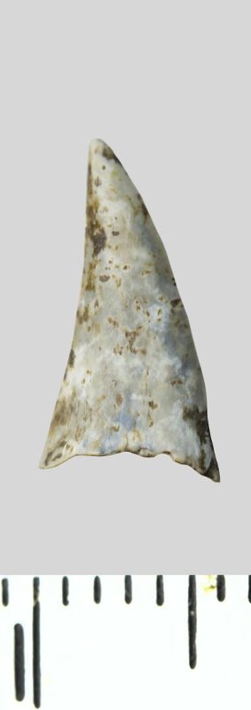 Зуб (фрагмент). Акула. Palaeohypotodus rutoti (Winkler, 1874). Классификация: Хордовые Chordata, Позвоночные Vertebrata, Хрящевые рыбы Chondrichthyes, Пластиножаберные Elasmobranchii