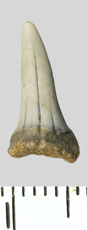 Зуб (фрагмент). Акула. Palaeohypotodus rutoti (Winkler, 1874). Классификация: Хордовые Chordata, Позвоночные Vertebrata, Хрящевые рыбы Chondrichthyes, Пластиножаберные Elasmobranchii