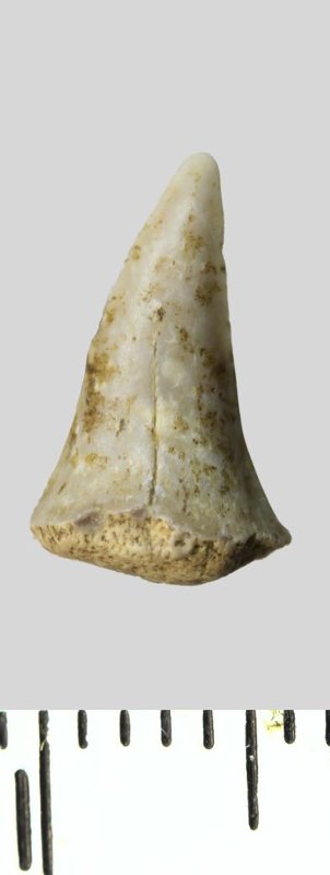 Зуб (фрагмент). Акула. Palaeohypotodus rutoti (Winkler, 1874). Классификация: Хордовые Chordata, Позвоночные Vertebrata, Хрящевые рыбы Chondrichthyes, Пластиножаберные Elasmobranchii
