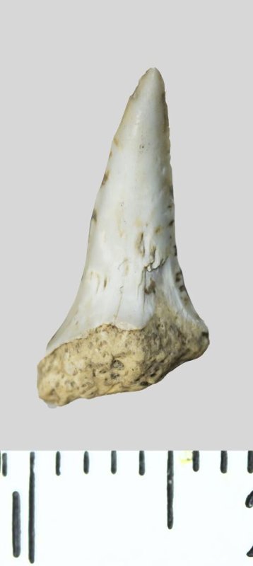 Зуб (фрагмент). Акула. Palaeohypotodus rutoti (Winkler, 1874). Классификация: Хордовые Chordata, Позвоночные Vertebrata, Хрящевые рыбы Chondrichthyes, Пластиножаберные Elasmobranchii