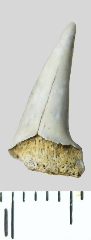 Зуб (фрагмент). Акула. Palaeohypotodus rutoti (Winkler, 1874). Классификация: Хордовые Chordata, Позвоночные Vertebrata, Хрящевые рыбы Chondrichthyes, Пластиножаберные Elasmobranchii