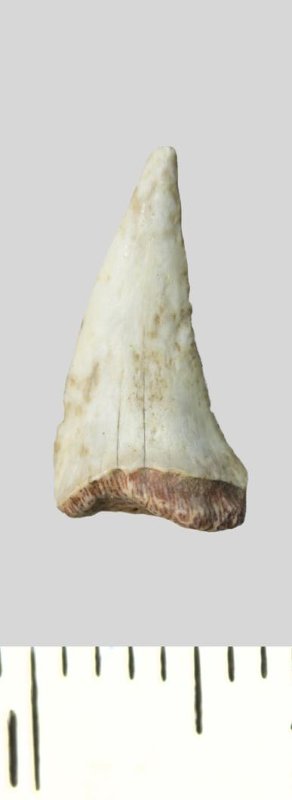 Зуб (фрагмент). Акула. Palaeohypotodus rutoti (Winkler, 1874). Классификация: Хордовые Chordata, Позвоночные Vertebrata, Хрящевые рыбы Chondrichthyes, Пластиножаберные Elasmobranchii