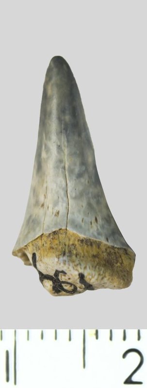 Зуб (фрагмент). Акула. Palaeohypotodus rutoti (Winkler, 1874). Классификация: Хордовые Chordata, Позвоночные Vertebrata, Хрящевые рыбы Chondrichthyes, Пластиножаберные Elasmobranchii