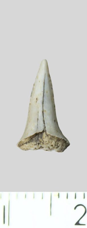 Зуб (фрагмент). Акула. Palaeohypotodus rutoti (Winkler, 1874). Классификация: Хордовые Chordata, Позвоночные Vertebrata, Хрящевые рыбы Chondrichthyes, Пластиножаберные Elasmobranchii
