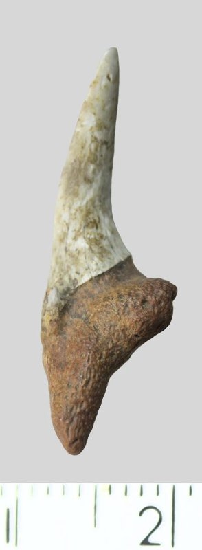 Зуб (фрагмент). Акула. Palaeohypotodus rutoti (Winkler, 1874). Классификация: Хордовые Chordata, Позвоночные Vertebrata, Хрящевые рыбы Chondrichthyes, Пластиножаберные Elasmobranchii