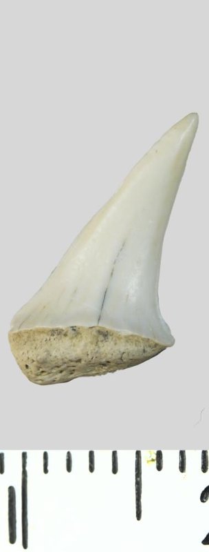 Зуб (фрагмент). Акула. Palaeohypotodus rutoti (Winkler, 1874). Классификация: Хордовые Chordata, Позвоночные Vertebrata, Хрящевые рыбы Chondrichthyes, Пластиножаберные Elasmobranchii