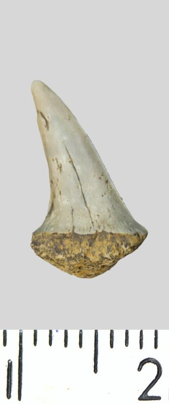 Зуб (фрагмент). Акула. Palaeohypotodus rutoti (Winkler, 1874). Классификация: Хордовые Chordata, Позвоночные Vertebrata, Хрящевые рыбы Chondrichthyes, Пластиножаберные Elasmobranchii