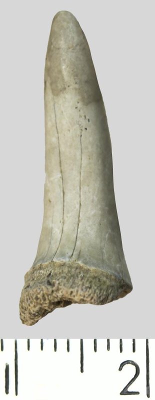 Зуб (фрагмент). Акула. Palaeohypotodus rutoti (Winkler, 1874). Классификация: Хордовые Chordata, Позвоночные Vertebrata, Хрящевые рыбы Chondrichthyes, Пластиножаберные Elasmobranchii