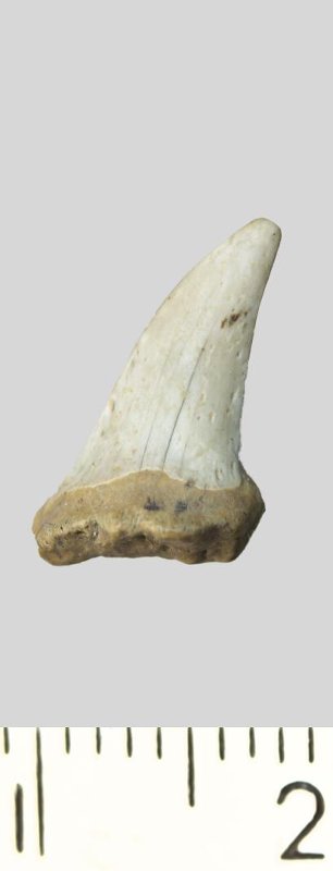 Зуб (фрагмент). Акула. Palaeohypotodus rutoti (Winkler, 1874). Классификация: Хордовые Chordata, Позвоночные Vertebrata, Хрящевые рыбы Chondrichthyes, Пластиножаберные Elasmobranchii