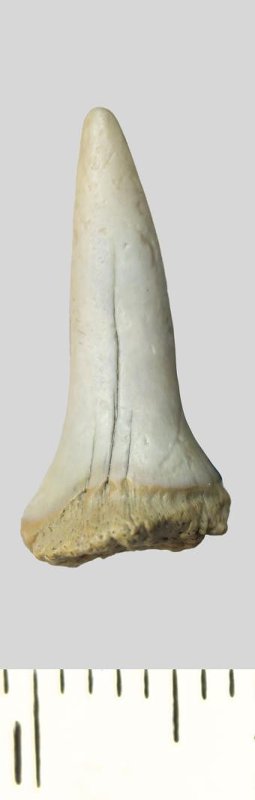 Зуб (фрагмент). Акула. Palaeohypotodus rutoti (Winkler, 1874). Классификация: Хордовые Chordata, Позвоночные Vertebrata, Хрящевые рыбы Chondrichthyes, Пластиножаберные Elasmobranchii
