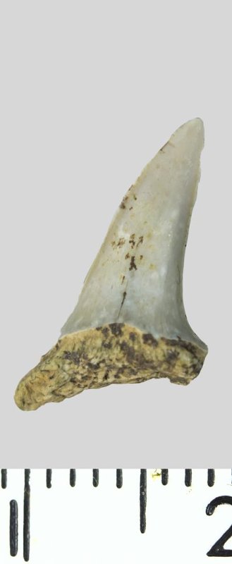 Зуб (фрагмент). Акула. Palaeohypotodus rutoti (Winkler, 1874). Классификация: Хордовые Chordata, Позвоночные Vertebrata, Хрящевые рыбы Chondrichthyes, Пластиножаберные Elasmobranchii