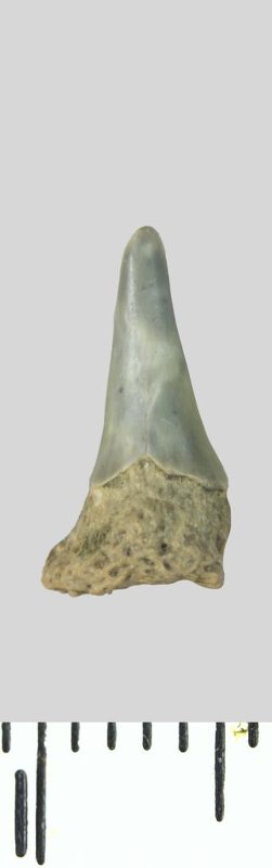 Зуб (фрагмент). Акула. Palaeohypotodus rutoti (Winkler, 1874). Классификация: Хордовые Chordata, Позвоночные Vertebrata, Хрящевые рыбы Chondrichthyes, Пластиножаберные Elasmobranchii