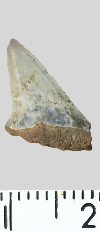 Зуб (фрагмент). Акула. Palaeohypotodus rutoti (Winkler, 1874). Классификация: Хордовые Chordata, Позвоночные Vertebrata, Хрящевые рыбы Chondrichthyes, Пластиножаберные Elasmobranchii