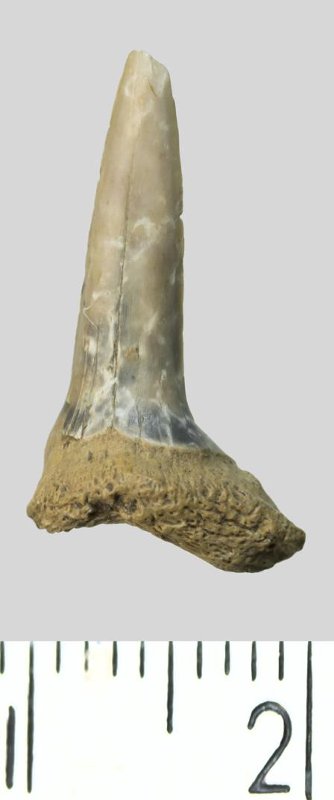 Зуб. Акула. Striatolamia striata (Winkler, 1874). Классификация: Хордовые Chordata, Позвоночные Vertebrata, Хрящевые рыбы Chondrichthyes, Пластиножаберные Elasmobranchii