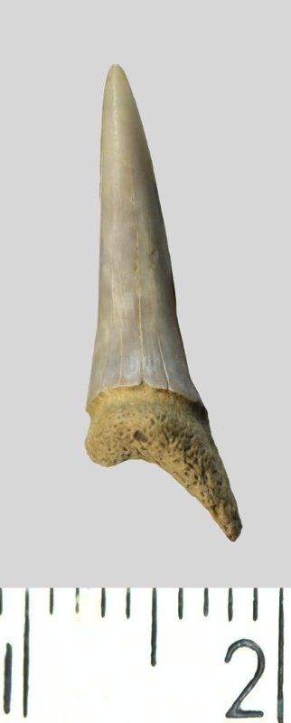Зуб. Акула. Striatolamia striata (Winkler, 1874). Классификация: Хордовые Chordata, Позвоночные Vertebrata, Хрящевые рыбы Chondrichthyes, Пластиножаберные Elasmobranchii
