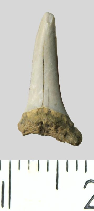 Зуб. Акула. Striatolamia striata (Winkler, 1874). Классификация: Хордовые Chordata, Позвоночные Vertebrata, Хрящевые рыбы Chondrichthyes, Пластиножаберные Elasmobranchii