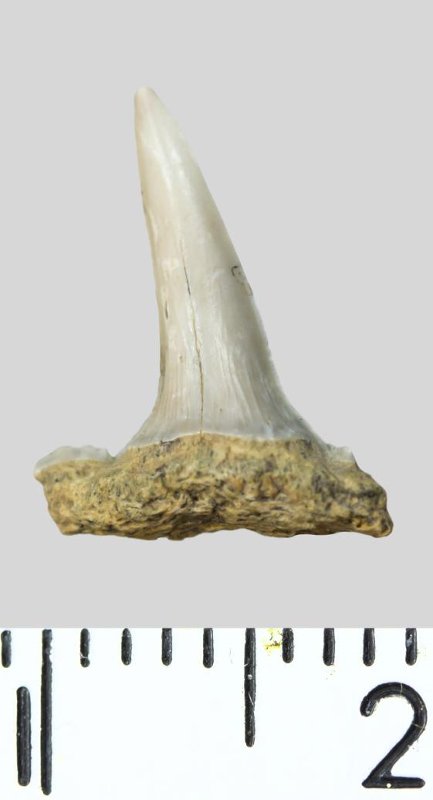 Зуб. Акула. Striatolamia striata (Winkler, 1874). Классификация: Хордовые Chordata, Позвоночные Vertebrata, Хрящевые рыбы Chondrichthyes, Пластиножаберные Elasmobranchii