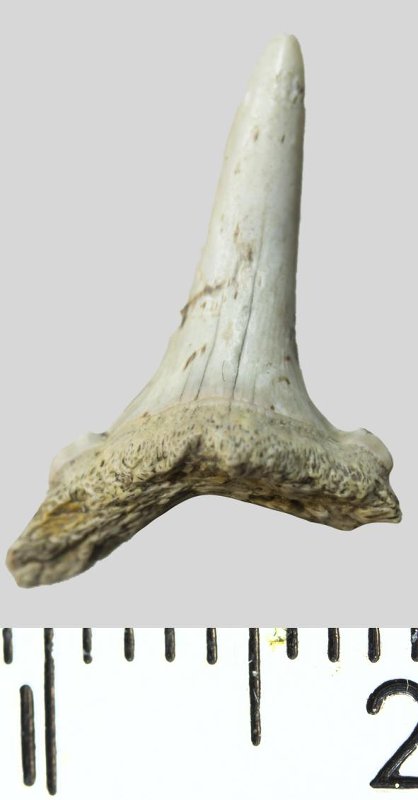 Зуб. Акула. Striatolamia striata (Winkler, 1874). Классификация: Хордовые Chordata, Позвоночные Vertebrata, Хрящевые рыбы Chondrichthyes, Пластиножаберные Elasmobranchii