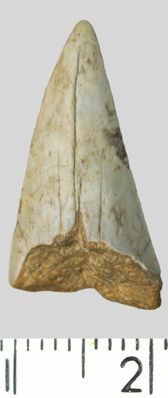 Зуб (фрагмент). Акула. Otodus minor mediavus (Leriche, 1942). Классификация: Хордовые Chordata, Позвоночные Vertebrata, Хрящевые рыбы Chondrichthyes, Пластиножаберные Elasmobranchii