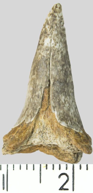 Зуб (фрагмент). Акула. Otodus minor mediavus (Leriche, 1942). Классификация: Хордовые Chordata, Позвоночные Vertebrata, Хрящевые рыбы Chondrichthyes, Пластиножаберные Elasmobranchii